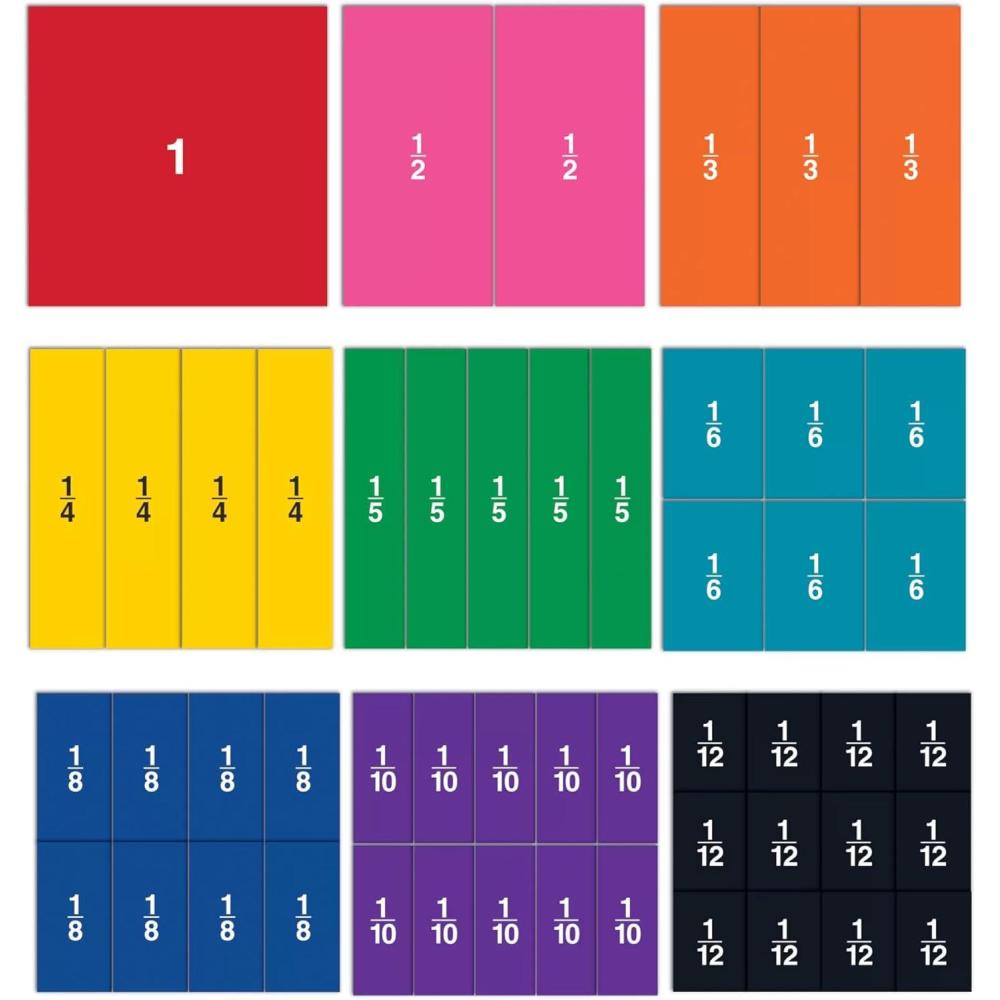 Set includes 51 pieces representing whole, halves, thirds, fourths, fifths, sixths, eighths, tenths, and twelfths. Color coding also matches many of our other fraction products. Whole square measures 61⁄2″L x 61⁄2″H.