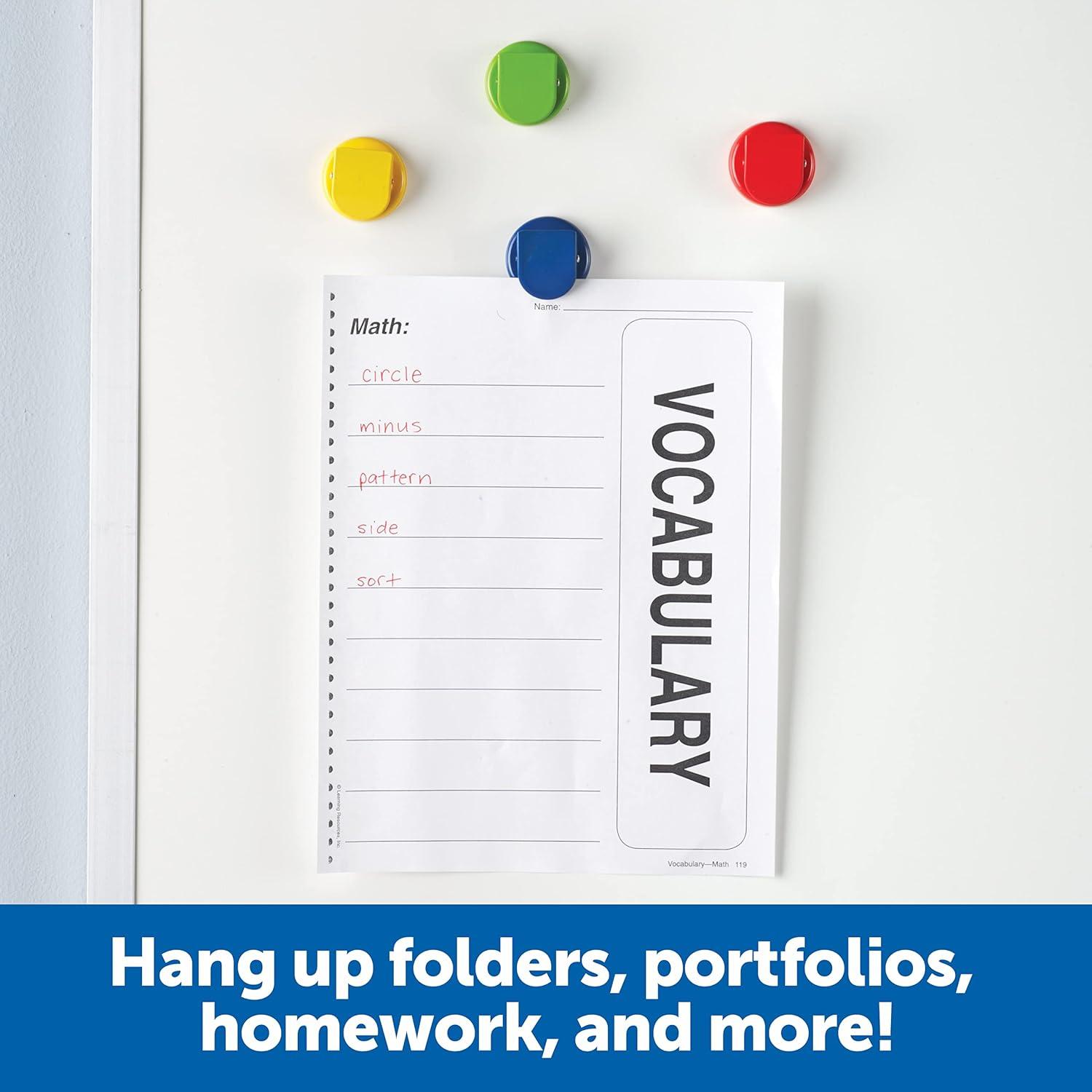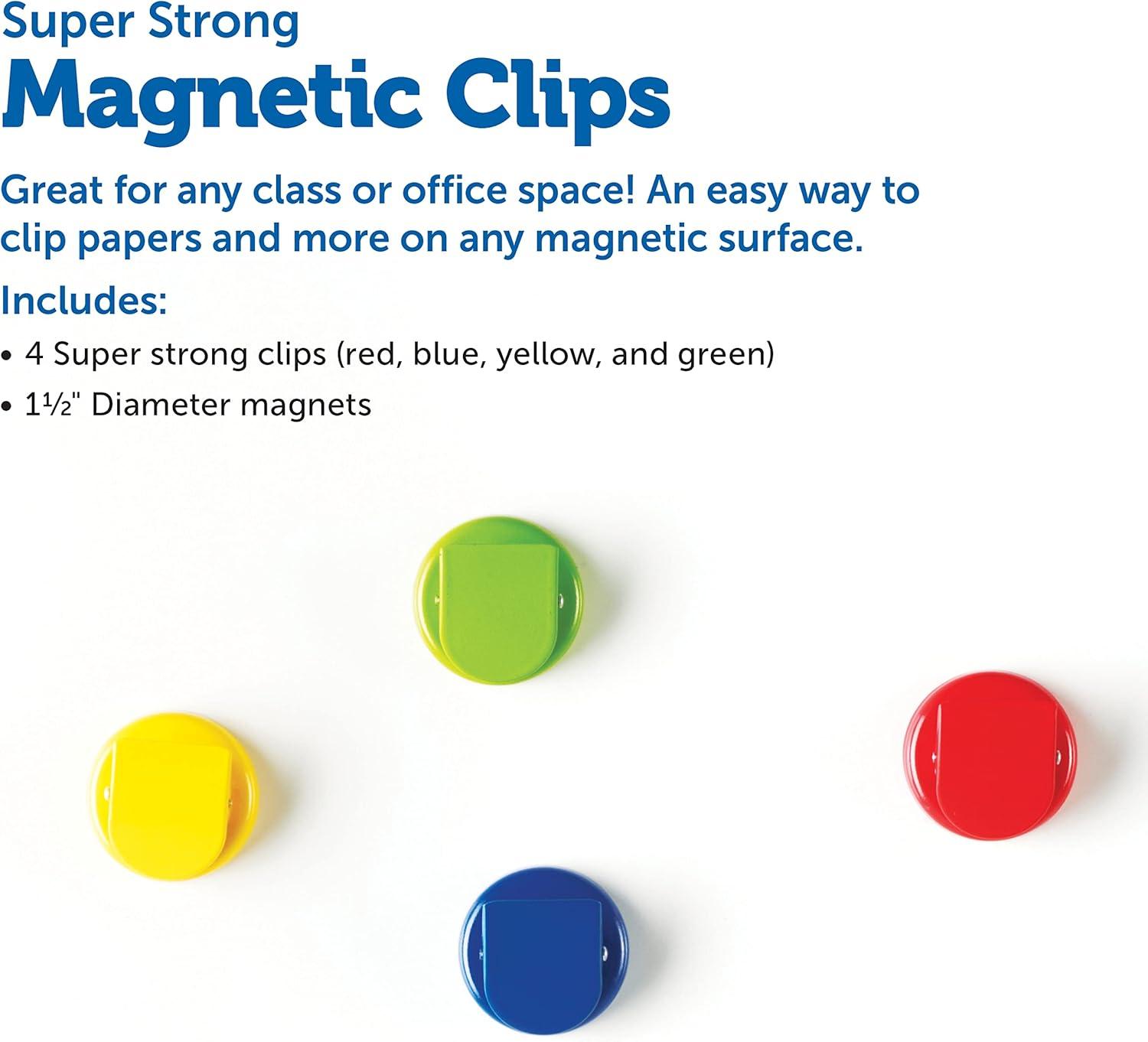 Learning Resources Super Strong Magnetic Clips hold folders, student portfolios, or large stacks of homework – up to 50 pages per clip! Use on whiteboards, file cabinets or any magnetic surface. Durable for long-lasting use. A versatile tool for keeping papers handy and organized! The Learning Resources Super Strong Magnetic Clips Set – 4 Piece Features: 4 strong magnetic clips in 4 great colors Size of 1″ in diameter each
